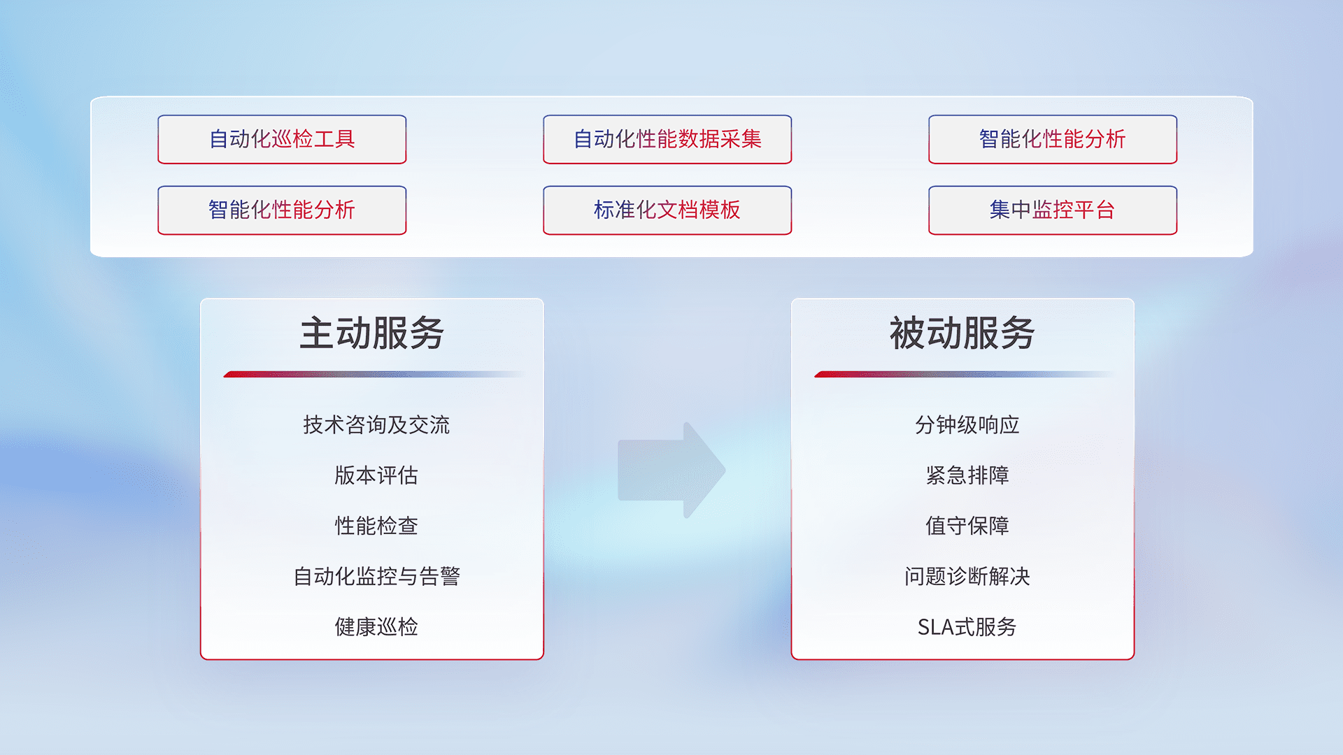 智能化工具和标准化文档,,保障服务质量,,,提供主动服务(包含技术咨询、、版本评估、、、、性能检查、、、、自动化监控与告警、、、健康巡检)和被动服务包含(分钟级响应、、、紧急排障、、、、值守保障、、、、问题诊断解决、、SLA服务)。。